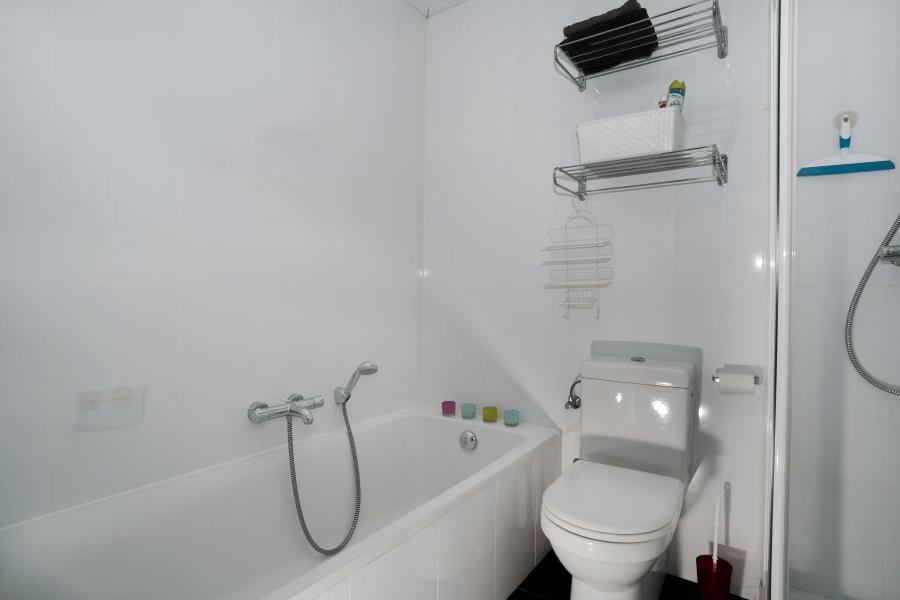 Badkamer met douche, ligbad en toilet op begane grond. Wastafel en toilet op de bovenverdieping.