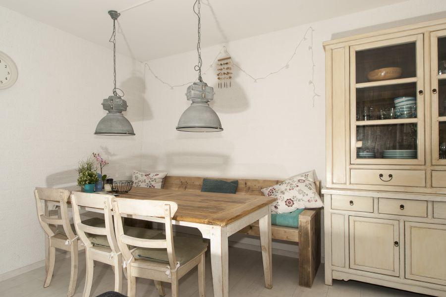 Comfortabele woon/eetkamer met grote eettafel, driezitsbank en grote fraaie buffetkast. De aankleding zorgt voor een gezellige sfeer. Via de deur in de woonkamer is de tuin en het terras toegankelijk.